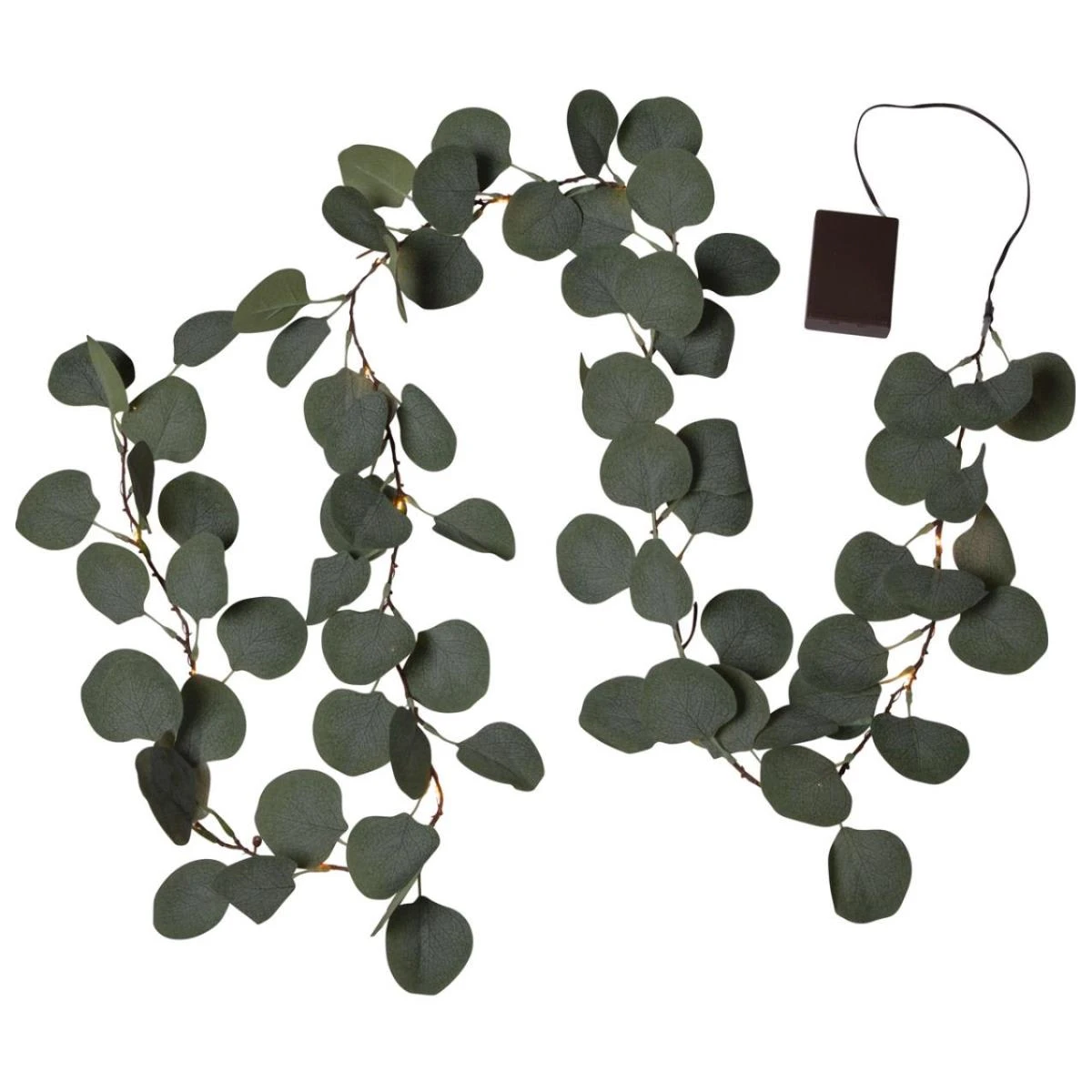 Die Lichterkette Eukalyptus hat 20 warmweiße LED, die an einer Ranke aus grünen Blättern befestigt sind.