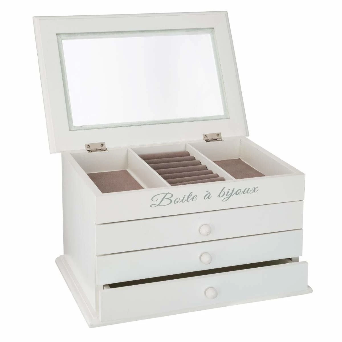 Der Schminktisch für Frauen kann ohne eine geeignete Schmuckschatulle und geliebte Schmuckstücke nicht existieren. Darin können Sie all Ihre Schmuckstücke sowie kleine Geheimnisse aussortieren. Drei geräumige Schubladen für angemessen verteilte Ketten, Uhren und Ketten, die sich nie wieder verheddern werden. Über ihnen ist eine zarte, stilvolle Dekoration. Die Oberseite der Box ist eine horizontale Vitrine, die in drei gleiche Abschnitte unterteilt ist – Sie können Ohrringe, Anhänger, Ringe oder was Sie besonders gerne aufbewahren, da der Deckel teilweise aus Glas besteht. Diese Kassette wird sicherlich jeder Frau von einem kleinen Mädchen bis zu einer reifen Dame gefallen. Auf wundersame Weise wird es auf einem Schminktisch oder auf einer Kommode im Schlafzimmer präsentiert. Es ergänzt Ihr Interieur mit einem femininen Accessoire und hilft Ihnen, Ihre Schätze sicher zu verstauen.