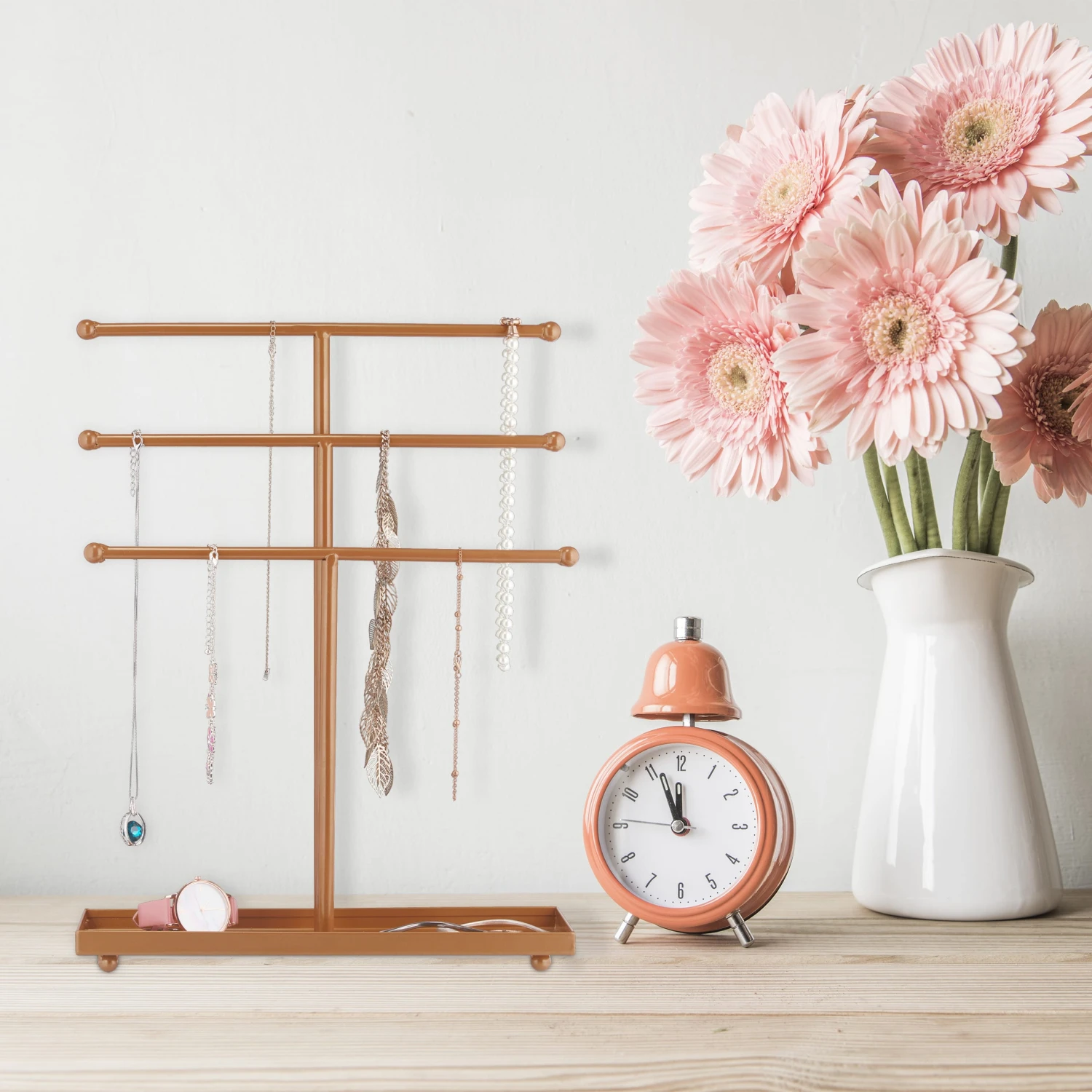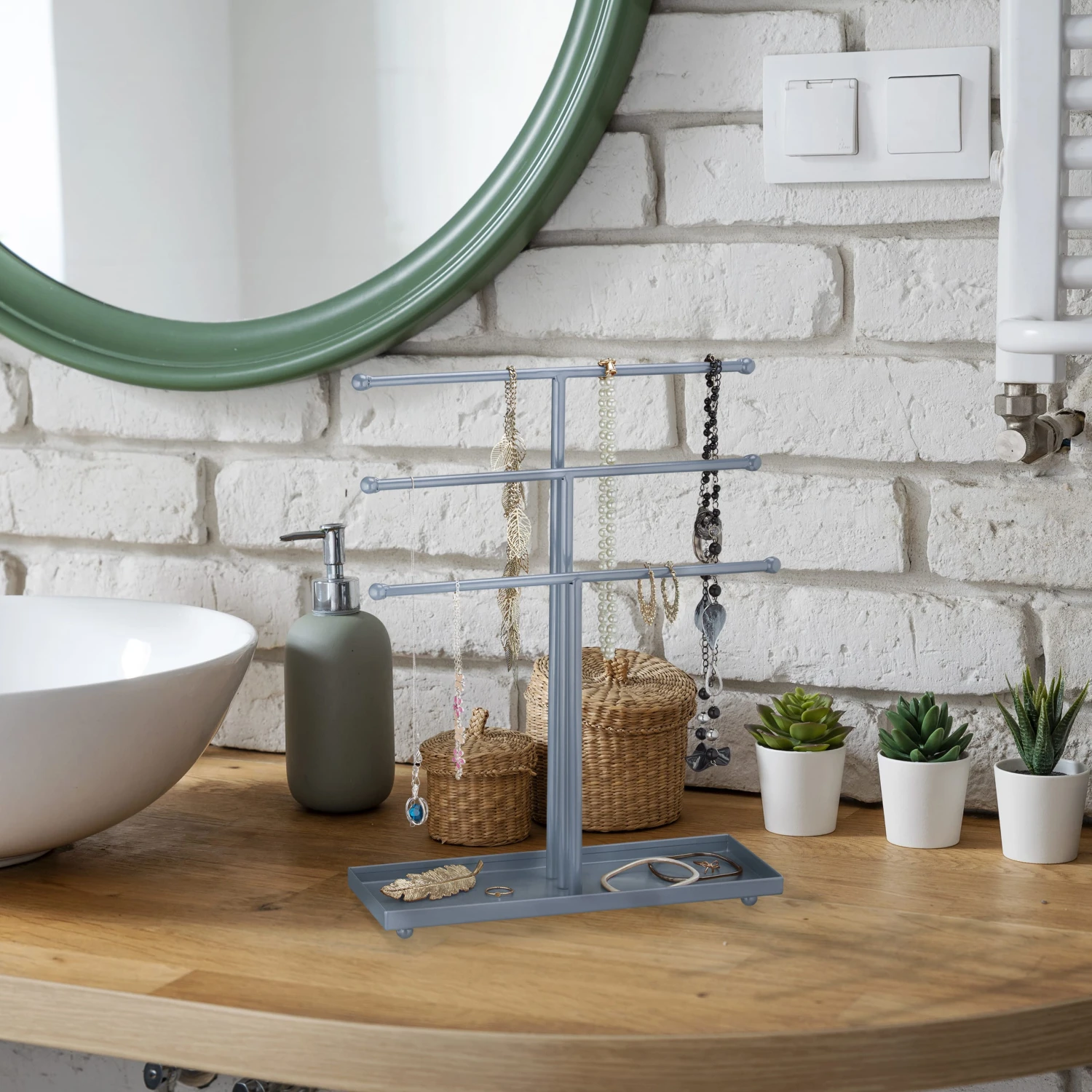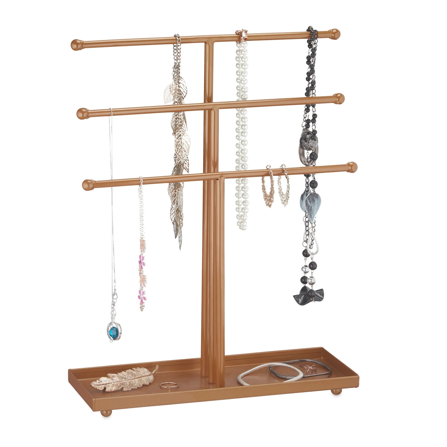 Mit dieser Schmuckhalterung gehören verhedderte Halsketten der Vergangenheit an. Mithilfe des Schmuckständers können unterschiedlich lange Ketten, Ringe, Armbänder und -reifen übersichtlich auf drei t-förmigen Stangen aufbewahrt und präsentiert werden. Zusätzlich verfügt der Schmuckbaum über eine Ablage, auf der Uhren, Ohrringe und Kosmetikartikel Platz finden. Dank der schlichten, zeitlosen Optik sorgt der Kettenorganizer für einen Hingucker im Schlafzimmer, Bad oder auf dem Schminktisch.