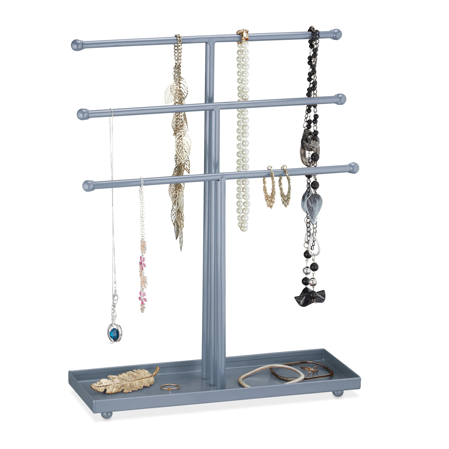 Mit dieser Schmuckhalterung gehören verhedderte Halsketten der Vergangenheit an. Mithilfe des Schmuckständers können unterschiedlich lange Ketten, Ringe, Armbänder und -reifen übersichtlich auf drei t-förmigen Stangen aufbewahrt und präsentiert werden. Zusätzlich verfügt der Schmuckbaum über eine Ablage, auf der Uhren, Ohrringe und Kosmetikartikel Platz finden. Dank der schlichten, zeitlosen Optik sorgt der Kettenorganizer für einen Hingucker im Schlafzimmer, Bad oder auf dem Schminktisch.