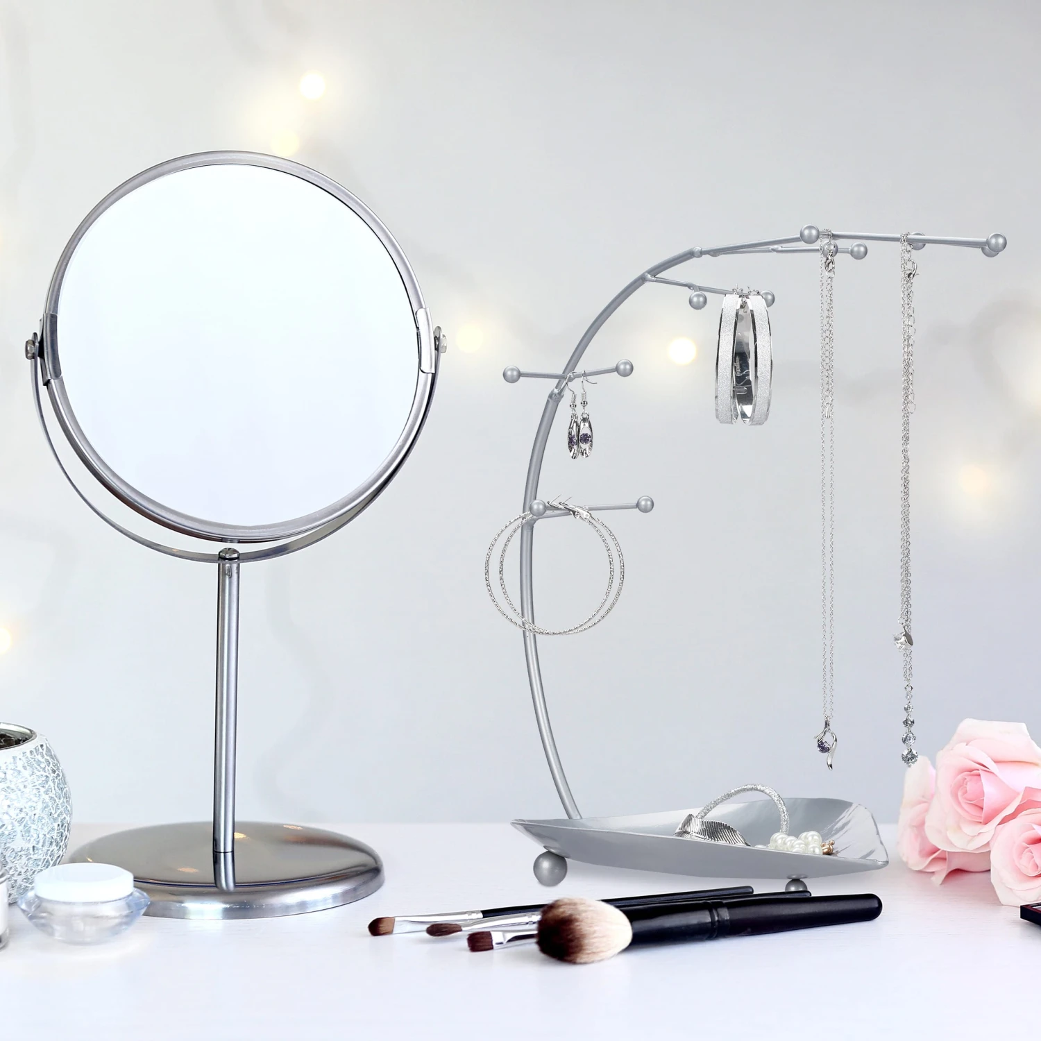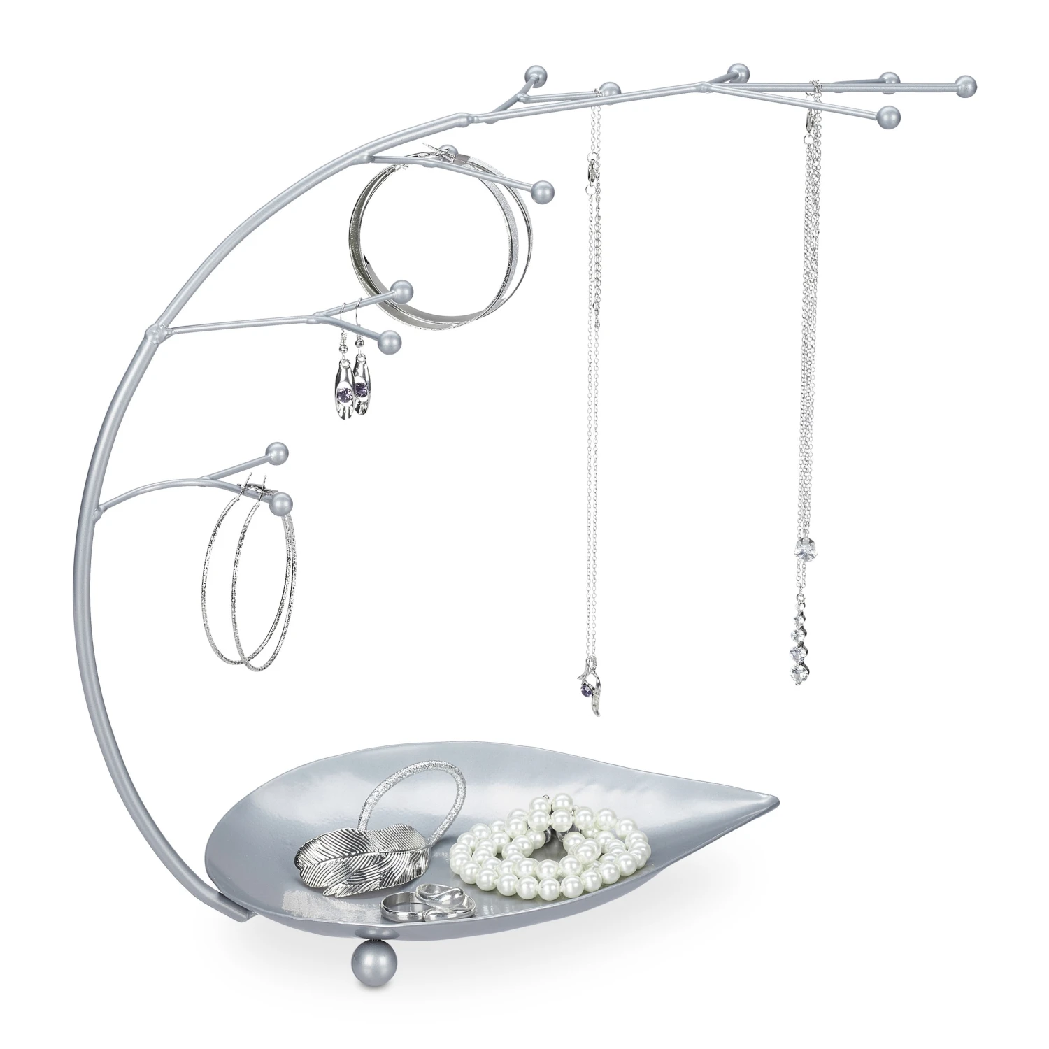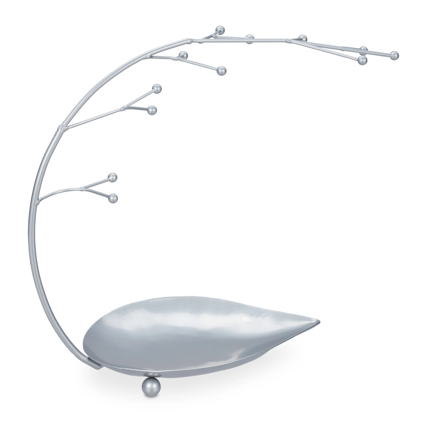 Mit diesem Schmuckständer gehören verhedderte Halsketten der Vergangenheit an. Der Kettenhalter bietet auf 12 Armen Platz für Halsketten, Ohrringe, Armbänder und -reifen. Auf der integrierten Schmuckablage lassen sich Ringe, Uhren und weitere Accessoires verstauen. Dank des naturinspirierten Designs mit Zweigen und Knospen und Ablage in Blattform wirkt der Halskettenständer besonders elegant und fügt sich dekorativ auf dem Schmink- oder Frisiertisch ein.